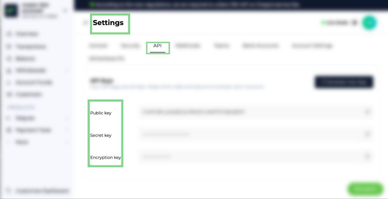 Merchants must keep these keys private to protect their systems from unauthorized access. You can get those keys under your settings.
